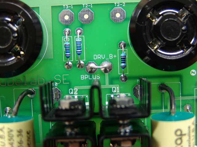 There are two solder pads in the area between the output tube sockets, located between R34 and R18. They are marked BPLUS and DRV_B+. For use as a driver board in conjunction with an external power supply and PowerDrive board, these pads are left alone. The external power supply will be connected to these (and other) pads. For ALL other applications, including driver board use with an interstage transformer, place a jumper between these two pads.